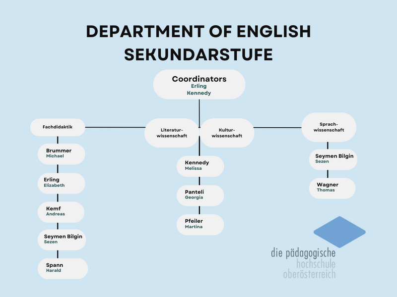 The Linz Group English comprises the JKU, the PHDL and the PHOÖ. Our team of 25 consists of full-time and part-time professors, lecturers, external lecturers, school teachers, teaching assistants and student tutors. Together we cover the Cluster Mitte B.Ed and M.Ed curriculum in the five main areas: teaching English as a foreign language, literary studies, culture studies, linguistics, and language proficiency.